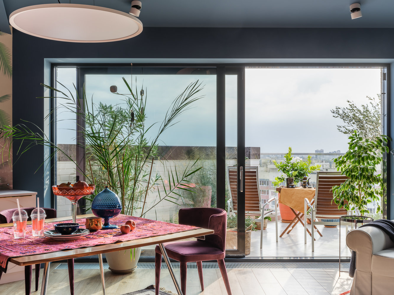 Одним из важных решений была установка прозрачной перегородки во всю стену между гостиной и террасой, это позволило визуально продлить пространство гостиной и впустить озеленение террасы в интерьер.