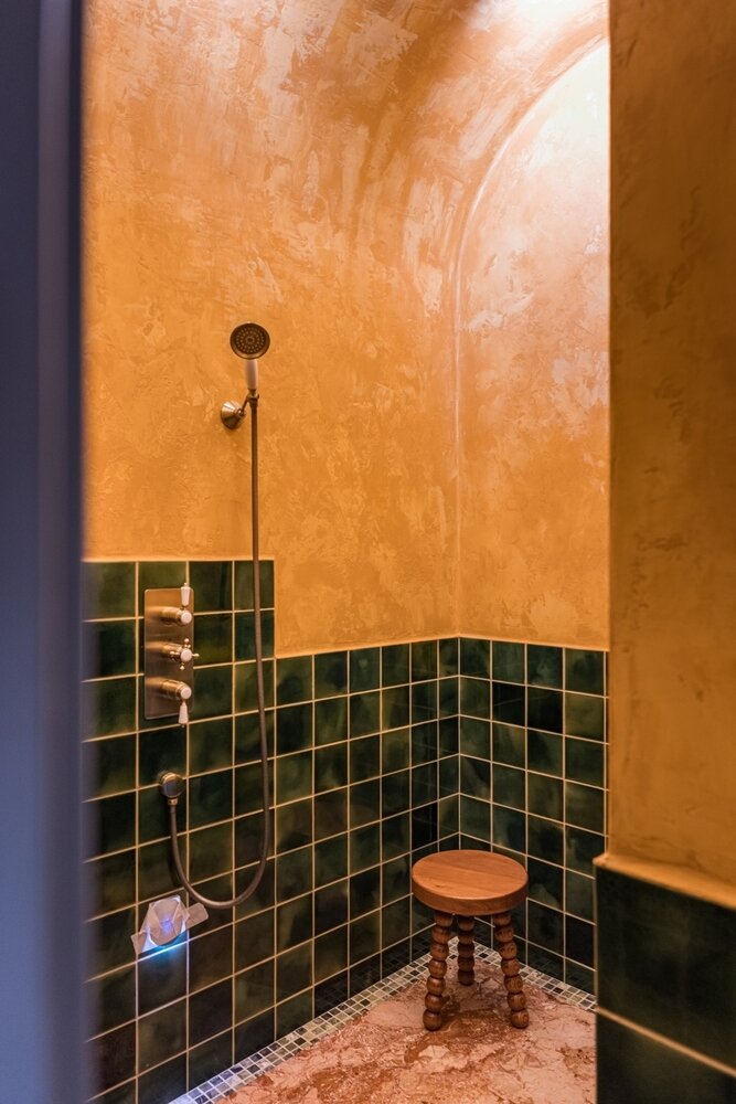 Еще одна изюминка хаммама — глазурованная плитка. Она контрастирует с матовостью штукатурки, цвет тоже подобран контрастный, изумрудный.