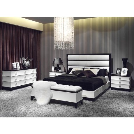 Кровать с высоким изголовьем выполнена в стиле Ар деко. Отделка перламутровый лак цвета слоновой кости. Шпонирована березой, тонированной в цвет горького шоколада. Изголовье обито натуральной кожей белого цвета. Сделана из высококачественного МДФ и массива дерева.