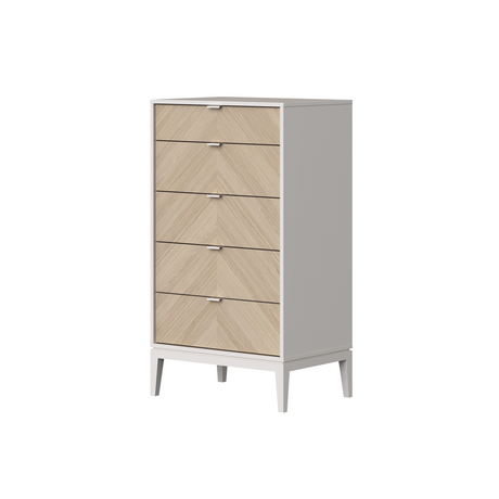- Каркас из массива бука — выдерживает нагрузку до 100 кг, стабилен и долговечен - Корпус из МДФ под эмалью — не выцветает и легко очищается влажной тканью - Фасады из тонированного шпона дуба — узор "елочка" добавляет текстуру и глубину - Пять вместительных ящиков — достаточно места для хранения постельного белья или сезонной одежды - Устойчивые ножки — комод не шатается даже на неровном полуДля кого подойдет
