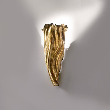 Оригинальный светильник-бра украсит фактурную поверхность стены направленным светом. Золотистый каркас из кованного металла станет весомым аргументом в декоре пространства.