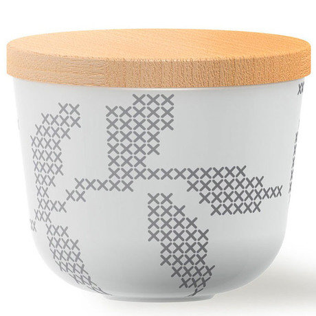 Вышивка крестиком - традиция многих культур, которая неизменно ассоциируется с чем-то домашним, приятным и уютным. Именно поэтому дизайнеры выбрали растительный принт и создали имитацию вышивки прямо на керамической поверхности. Выглядит потрясающе. Чаша в комплекте с деревянной крышкой подойдет как для хранения продуктов (сахара, кофе, специй), так и для сервировки. Можно мыть в посудомоечной машине.