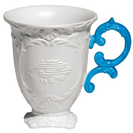 Постмодернистская интерпретация традиций дизайна посуды французского королевского двора XIX века. Коллекция посуды от итальянского бренда Seletti настолько великолепна, что занимает особое место в постоянной экспозиции Музея Искусств и Дизайна в Нью-Йорке. Белая фарфоровая кружка с яркой голубой ручкой в стиле барокко - великолепный её представитель.