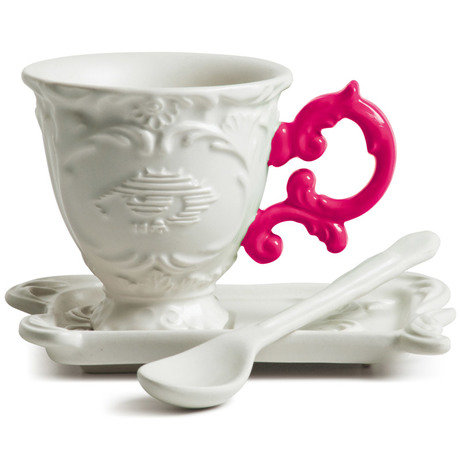 Постмодернистская интерпретация традиций дизайна посуды французского королевского двора XIX века. Коллекция посуды от итальянского бренда Seletti настолько великолепна, что занимает особое место в постоянной экспозиции Музея Искусств и Дизайна в Нью-Йорке. Набор из белой фарфоровой чашки с яркой розовой ручкой, ложки и блюдца в стиле барокко - великолепный её представитель.