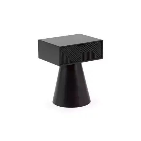 Тумба прикроватная Parex отличается художественной эстетикой. Фишка — игра геометрии. Прямоугольная столешница с вкладным ящиком изящно балансирует на верхушке конуса. Можно использовать как необычную прикроватную тумбу, элегантный приставной столик в гостиной, вместо консоли, полочки для мелочей в прихожей. Фасад вкладного ящика украшен узором, который формируют трендовую «гофрированность».