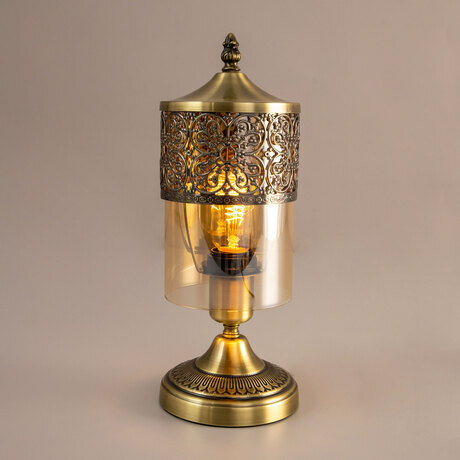 Прекрасный настольный светильник Citilux Эмир CL467813 выполнен в восточном стиле. Корпус металлический, благородного бронзового цвета. Плафон цилиндрической формы изготовлен из прозрачного стекла светло-янтарного оттенка. Светильник искусно украшен ажурной чеканкой.